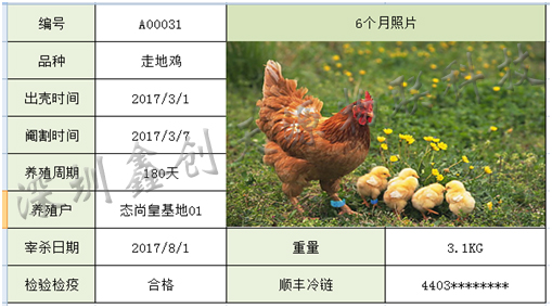 感應后自動生成的信息圖例 4、宰殺家禽出籠后,進行檢驗檢疫,宰殺。“白條禽”(宰殺完畢后經冷藏保存的禽肉) 摘下雞腳環,并讀取腳環信息,生成二維碼標簽,隨禽肉一起包裝。