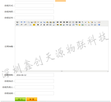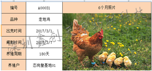 3、養殖信息:①編號:當手持機感應后自動生成,具有唯一性;我們可根據編號進行后臺編輯管理。用戶可根據該編號進入手機APP或網址查看該頁面信息。 ②品種:由手持機設定后感應自動生成,也可進入后臺進行修改。 ③出殼閹割時間:由手持機設定后感應自動生成,也可進入后臺進行修改。 ④養殖周期:跟根出殼時間與查看時的系統時間相減后自動生成,如周期達到設定月份時自動變色。 ⑤養殖戶:如土雞是分2個或2個以上養殖戶飼養,輸入后方便查看該土雞所在養殖場,便于銷售。 ⑥其它信息更新:由后期通過后臺上傳。 ⑦訂購信息:如該雞預訂后,由后臺輸入預訂信息。