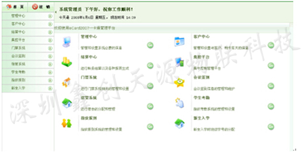 系統平臺應用包括:管理中心、客戶中心、結算中心、集控平臺、門禁系統、會議簽到、宿管系統、學生考勤、指紋報到、新生入學等RFID技術所涉及的業務應用。 四、商務消費管理系統